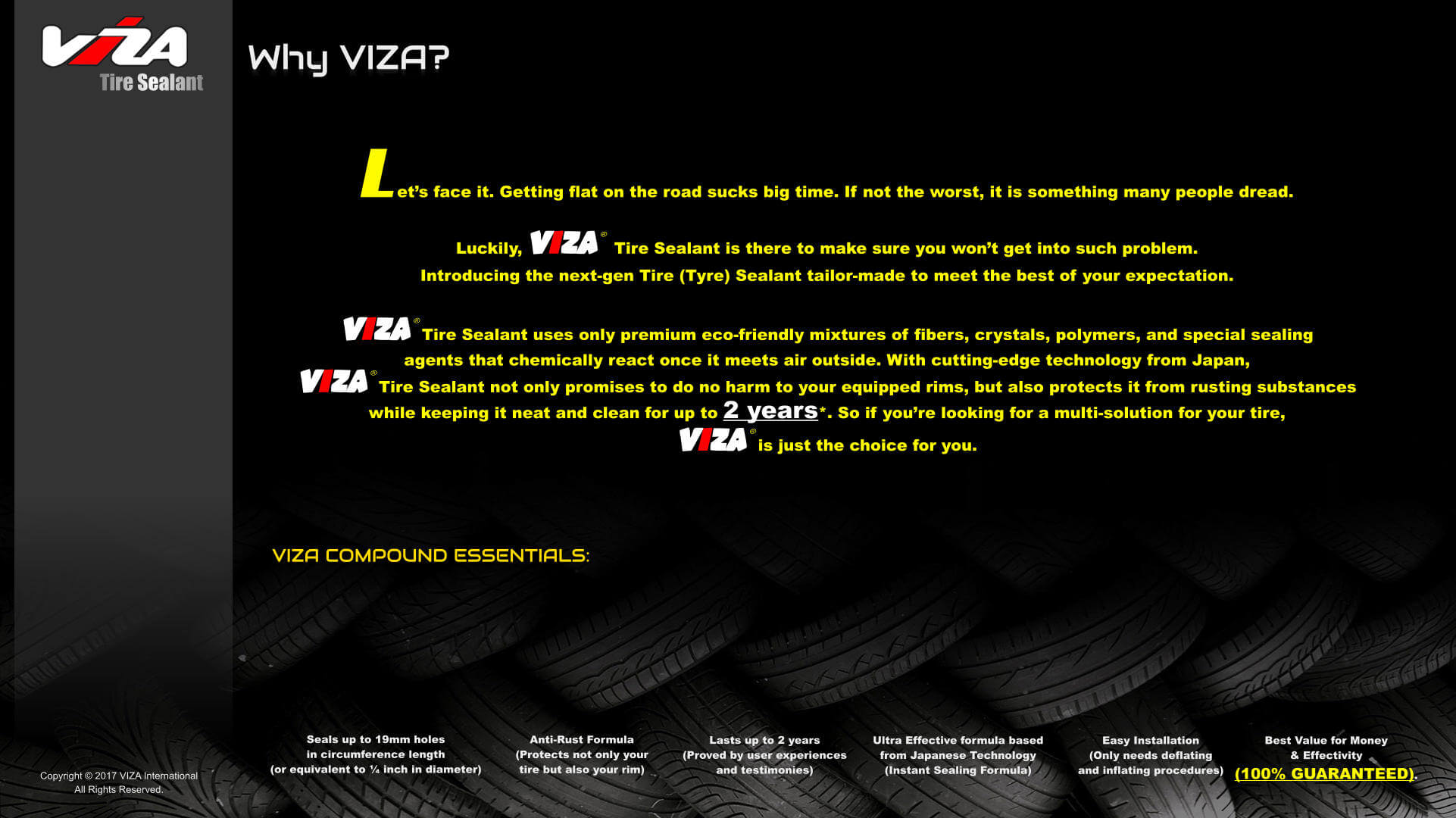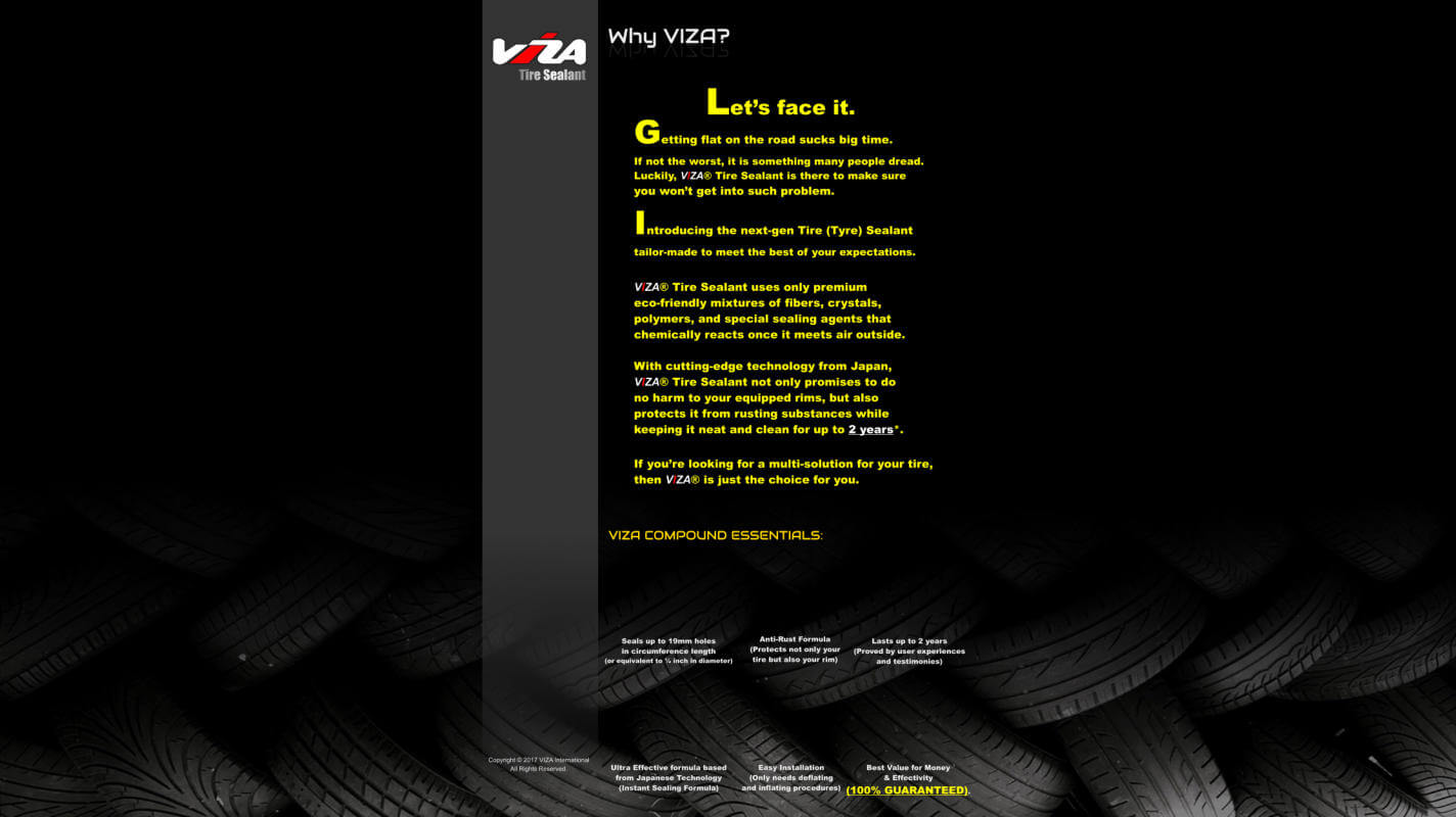 VIZA® Tire Sealant boasts its avant-garde, innovative formula together with a groundbreaking price point which makes VIZA® stand out considerably.
